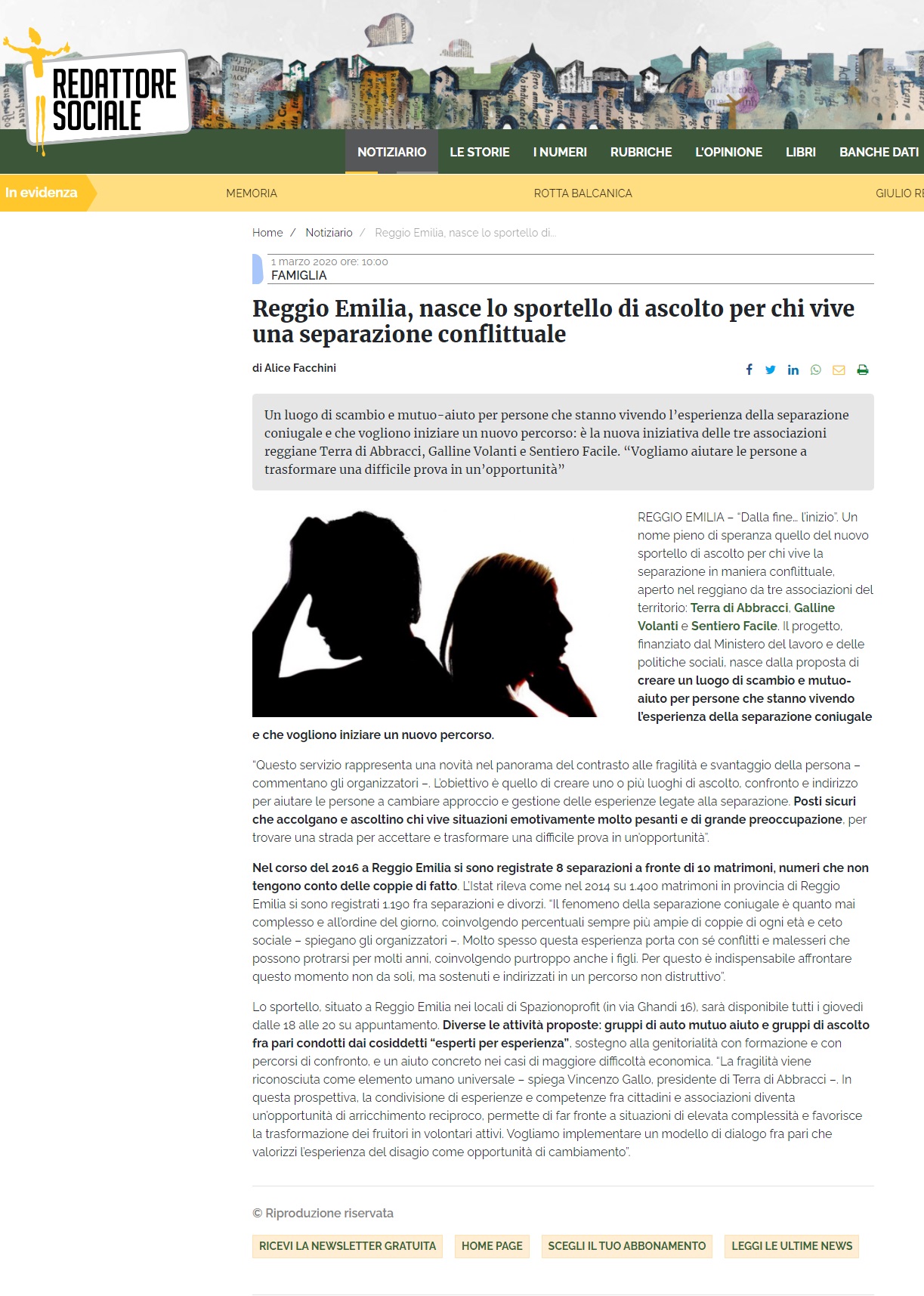Redattore Sociale: articolo sullo sportello di ascolto “Dalla fine… l’inizio” 1_03_2020